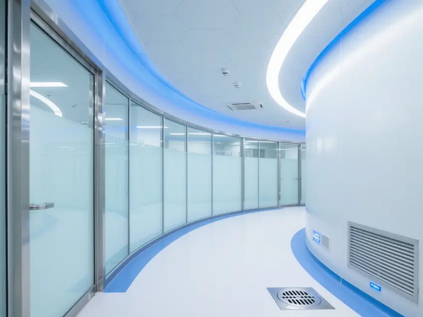 整個車間以白色為主色調(diào),搭配藍(lán)色的燈光裝飾,營造出一種干凈、專業(yè)且略帶科技感的氛圍。地面和墻面都采用了光滑的材質(zhì),便于清潔和保持衛(wèi)生。