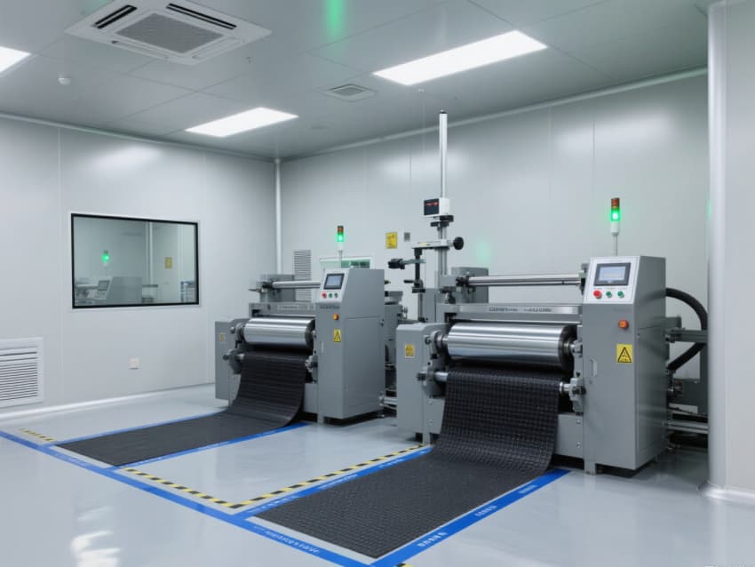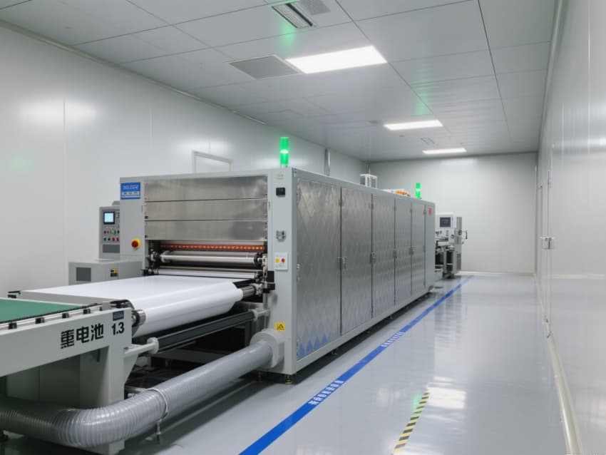 車(chē)間以銀灰色抗菌金屬彩鋼板搭建墻體與吊頂,搭配淺灰色防靜電環(huán)氧地坪,金屬質(zhì)感的建材兼具抗電解液腐蝕、易清潔特性,地面藍(lán)色防靜電標(biāo)識(shí)線(xiàn)清晰劃分涂布、卷繞、裝配等工序區(qū)域。頂部高效過(guò)濾器與定向?qū)恿飨到y(tǒng),實(shí)現(xiàn)每小時(shí)18-22次空氣置換,配合除濕機(jī)組將濕度精準(zhǔn)控制在20-30%RH,避免水分影響電芯性能。?