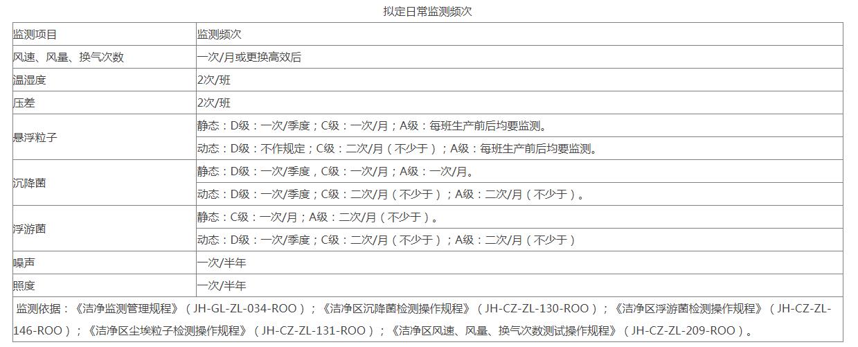 15、異常情況處理:系統(tǒng)運(yùn)行確認(rèn)過(guò)程中,應(yīng)嚴(yán)格按照各標(biāo)準(zhǔn)操作程序、維護(hù)保養(yǎng)程序、設(shè)計(jì)要求進(jìn)行操作和判定。出現(xiàn)個(gè)別項(xiàng)目不符合標(biāo)準(zhǔn)的結(jié)果時(shí),應(yīng)按下列程序進(jìn)行處理:潔凈室空氣環(huán)境監(jiān)測(cè)出現(xiàn)個(gè)別房間個(gè)別指標(biāo)不合格的則應(yīng)重新取樣一次,檢測(cè)不合格的指標(biāo);其它運(yùn)行確認(rèn)項(xiàng)目不符合要求時(shí),應(yīng)重新調(diào)試或請(qǐng)供應(yīng)商現(xiàn)場(chǎng)調(diào)試;若屬設(shè)備方面的原因,必要時(shí)報(bào)確認(rèn)小組,調(diào)整設(shè)備運(yùn)行參數(shù)或?qū)υO(shè)備進(jìn)行處理。  監(jiān)測(cè)依據(jù):《潔凈監(jiān)測(cè)管理規(guī)程》(JH-GL-ZL-034-ROO);《潔凈區(qū)沉降菌檢測(cè)操作規(guī)程》(JH-CZ-ZL-130-ROO);《潔凈區(qū)浮游菌檢測(cè)操作規(guī)程》(JH-CZ-ZL-146-ROO);《潔凈區(qū)塵埃粒子檢測(cè)操作規(guī)程》(JH-CZ-ZL-131-ROO);《潔凈區(qū)風(fēng)速、風(fēng)量、換氣次數(shù)測(cè)試操作規(guī)程》(JH-CZ-ZL-209-ROO)。