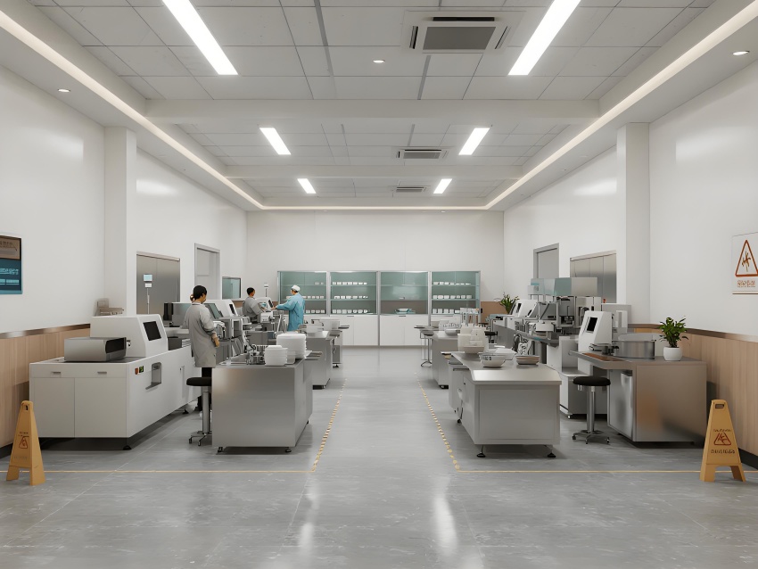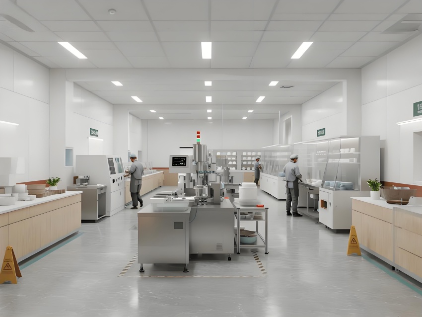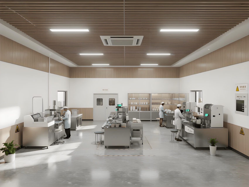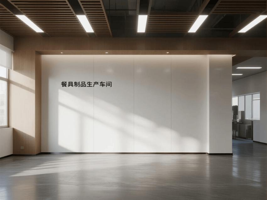 本餐具制品車間設計以現代簡約工業風為核心,融合高效生產與視覺舒適性。色調以純凈白(墻面)、淺木色(倉儲柜)和不銹鋼銀灰(設備)為主,營造清爽專業的氛圍。