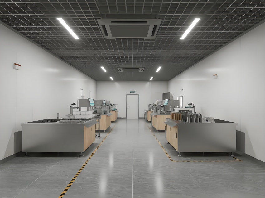 地面采用深灰色環氧防滑地坪,耐磨抗壓且易清潔;墻面使用白色抗污納米涂層鋼板,無縫拼接避免積灰;頂面設計為開放式黑色網格吊頂,裸露管線增強工業感,搭配高效LED條形燈帶提供無影照明。