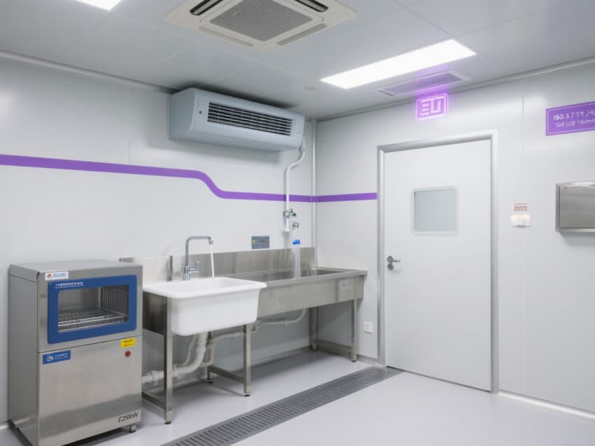 空間配備嵌入式LED潔凈燈(照度≥400lux)、恒溫恒濕控制系統(溫度22±1℃,濕度50±3%),不銹鋼潔凈門窗采用高氣密性密封結構。實驗區預留高精度儀器接口與防靜電接地端子,紫色氣流流線標識引導操作動線,全方位保障精密實驗的準確性與穩定性。