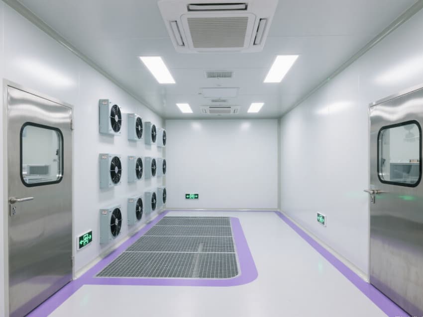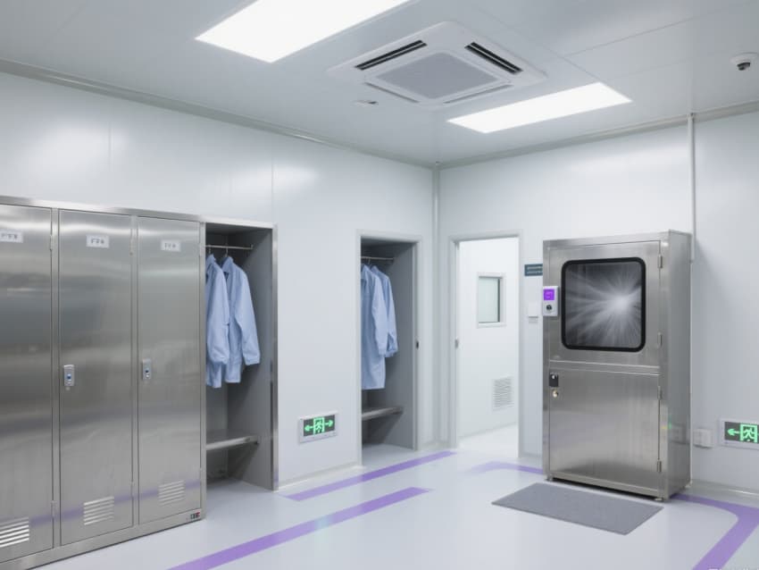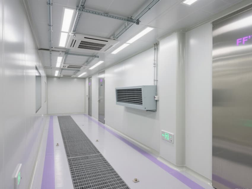 實驗室以銀白色抗菌金屬彩鋼板構建墻體與吊頂,搭配淺灰色防靜電環氧地坪,金屬質感與冷色調結合,既強化潔凈氛圍,又具備抗腐蝕、易消毒特性。墻面與地面的圓弧過渡設計消除積塵死角,頂部密布的FFU風機過濾單元形成垂直層流,配合側下回風系統,實現每小時25-30次空氣置換,持續維持室內正壓。?
