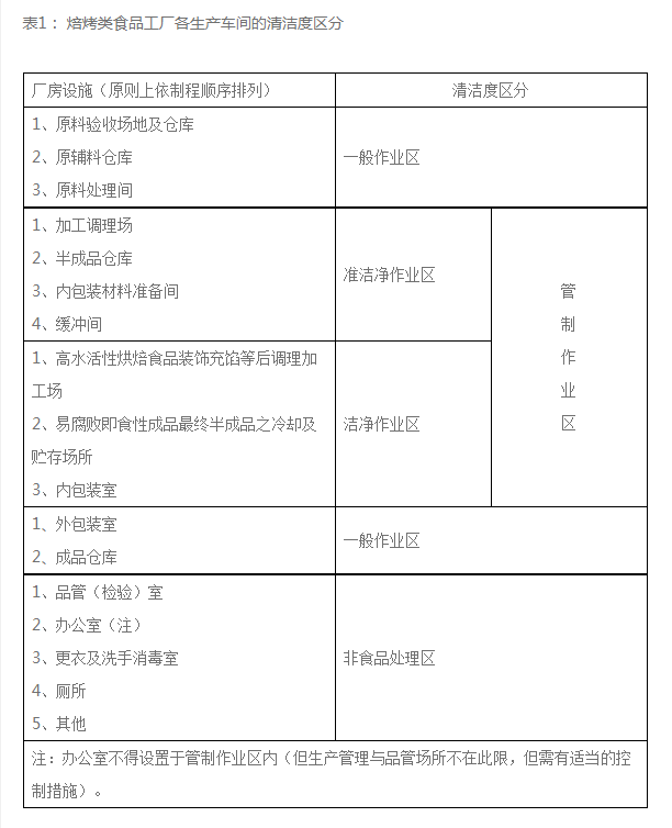 表1: 焙烤類食品工廠各生產車間的清潔度區分